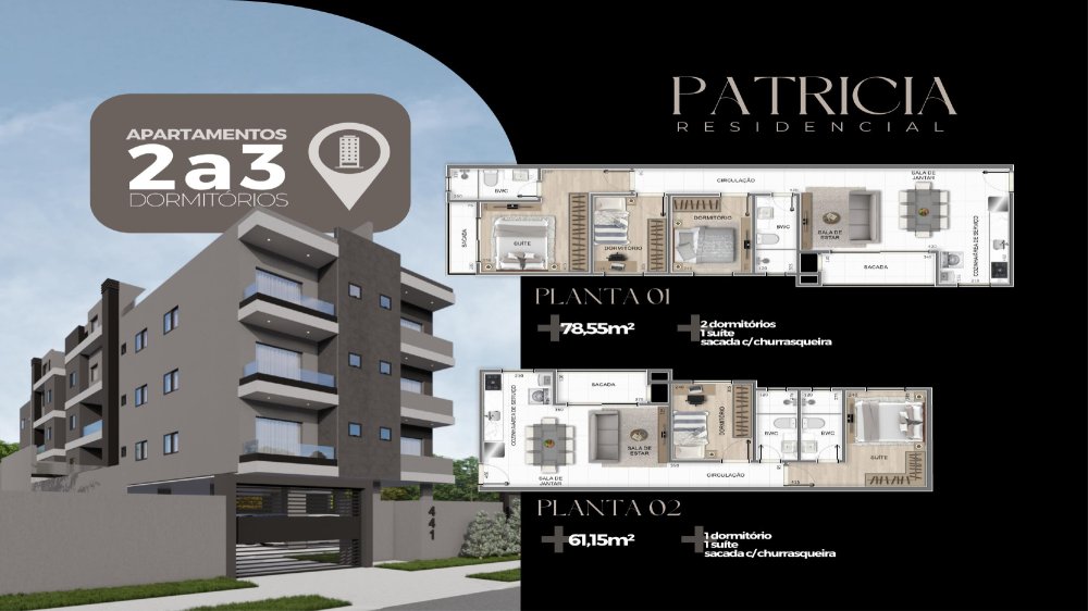 Residencial com 12 unidades com 3 dormitórios sendo uma suíte; 2 dormitórios sendo uma suite; Cobertura duplex (2 e 3 dormitórios).
