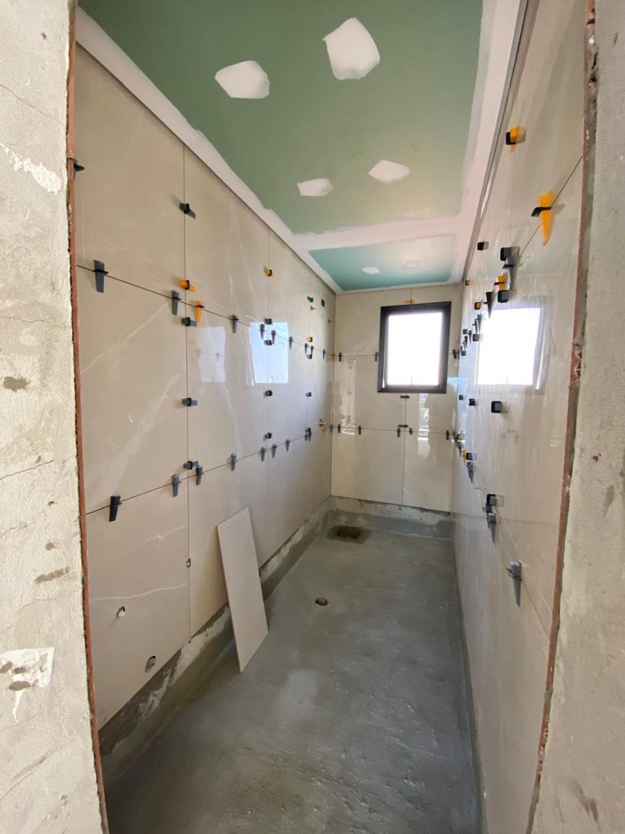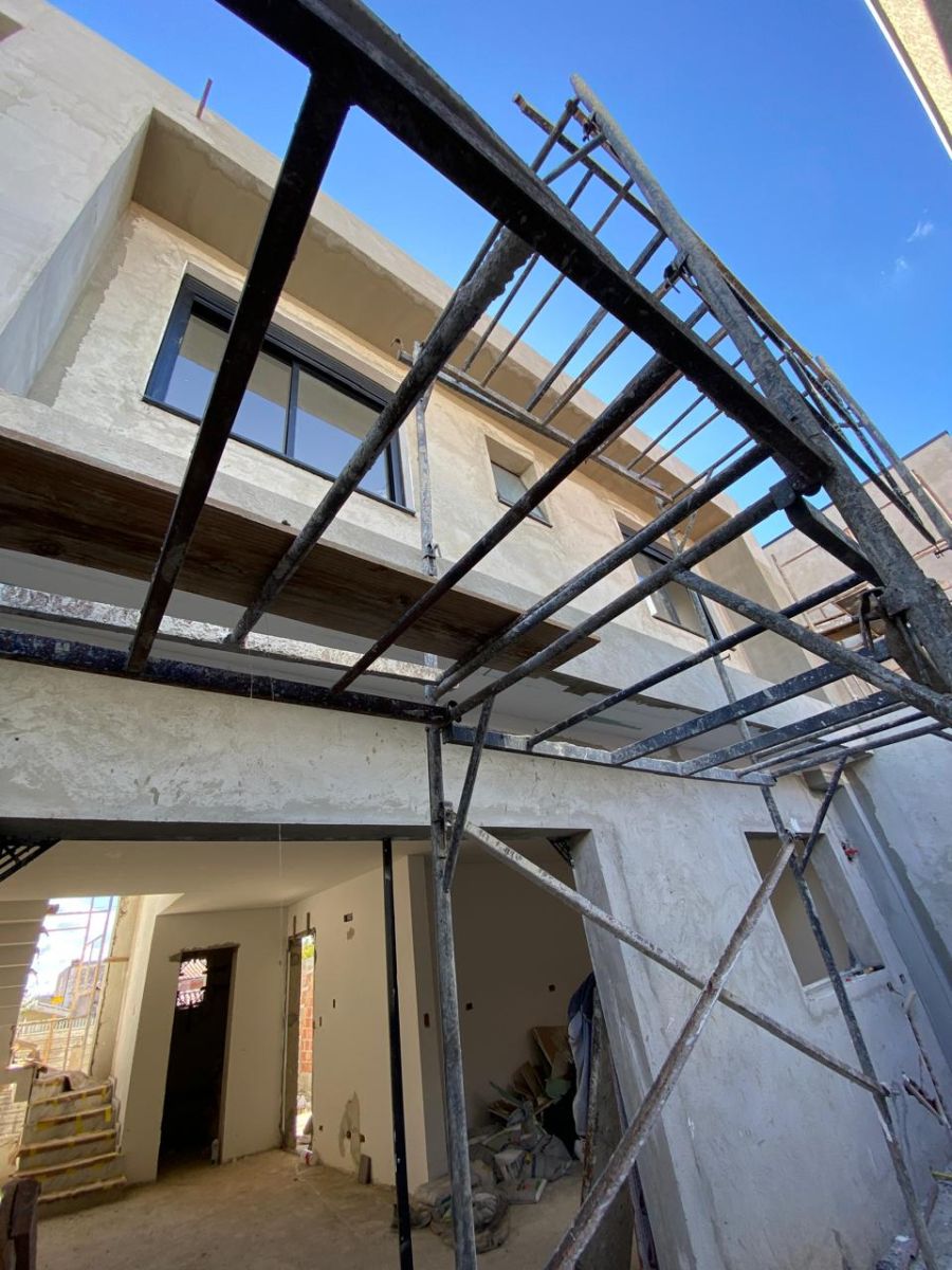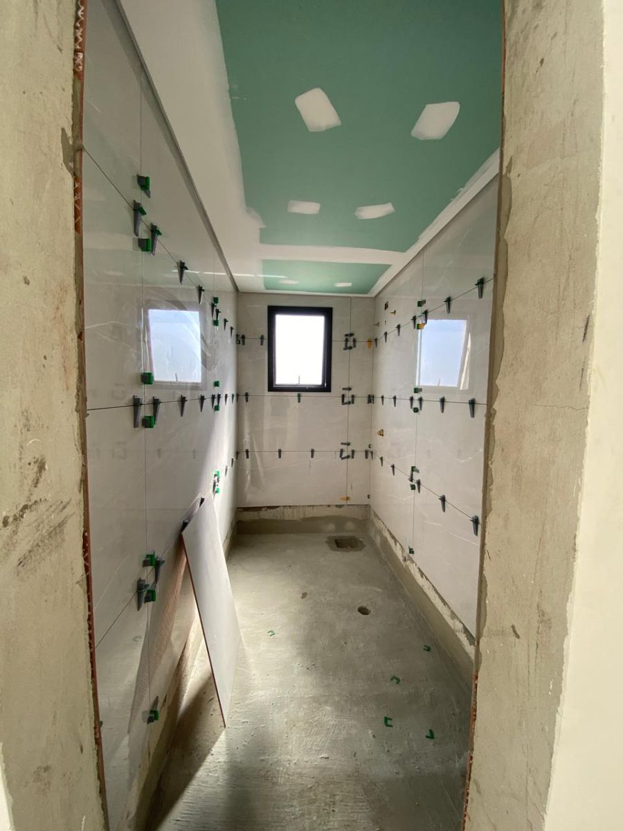 Os quartos possuem persianas automatizadas e piso laminado, com possibilidade de escolha pelo cliente. Escadas, pias e nichos em mármore branco rajado reforçam o alto padrão construtivo. O sobrado dispõe ainda de sistema de aquecimento a gás, fachada moderna com vidro temperado na escada, esquadrias em alumínio e porta principal em ACM.