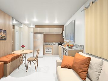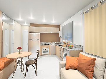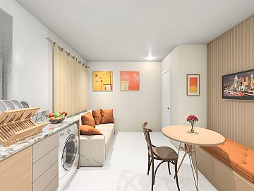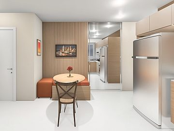 A unidade Garden conta com 1 quarto, 1 banheiro, cozinha integrada com sala de estar, garden privativo medindo 13,58m2 privativos os imóveis possuem financiamento disponível pela Caixa Econômica Federal, por meio do programa Minha Casa Minha Vida, com possibilidade de utilização do FGTS como entrada.